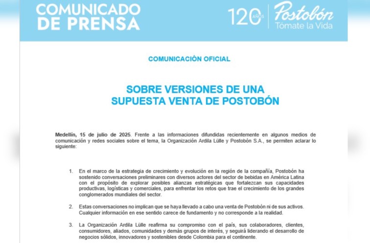 La Organización Ardila Lülle informó que Postobón no está en venta pero reconoció que adelanta “conversaciones (con actores del sector de bebidas en América Latina)” sin que implique se haya concretado alguna negociación tanto de la embotelladora ni de sus activos.