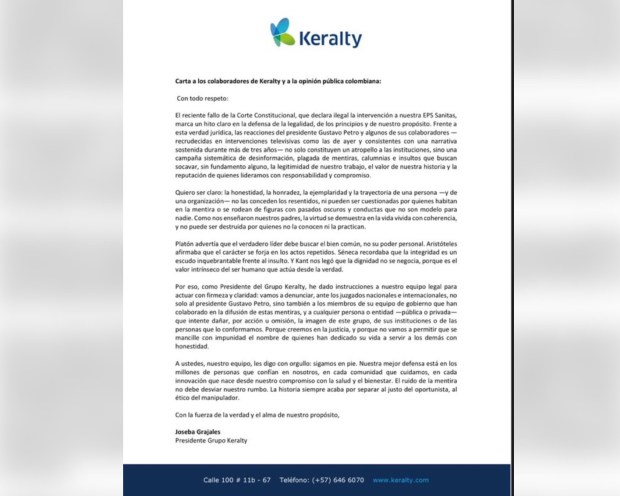 Según Keralty, dichas declaraciones constituyen una campaña sistemática de desinformación que busca socavar la legitimidad del trabajo del grupo, su trayectoria y la reputación de sus líderes.