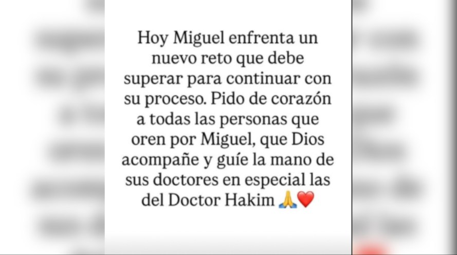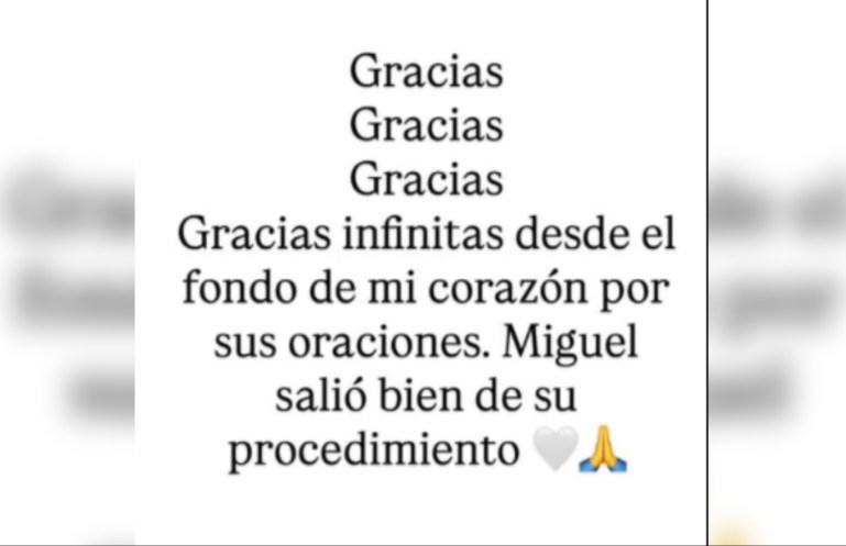 Luego, en otra publicación en las historias de esa red social señaló: «Gracias, gracias, gracias. Gracias infinitas desde el fondo de mi corazón por sus oraciones. Miguel salió bien de su procedimiento”.