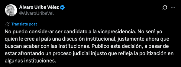 El expresidente Uribe declinó este viernes esa posibilidad y aseguró en su cuenta en X enfáticamente: “No puedo considerar ser candidato a la vicepresidencia”.