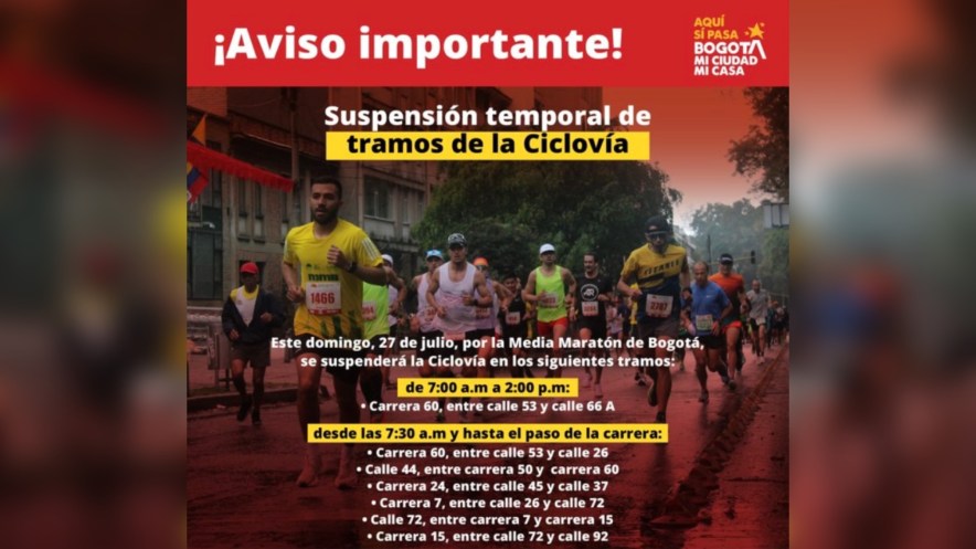 Tramos que se habilitarán con el paso de la media maratón de Bogotá 2025, desde las 7:30 a. m. y hasta el paso de la carrera: