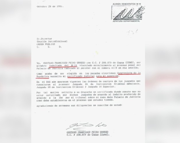 La misiva que lleva el logotipo de la jefatura departamental de la Alianza Democrática M-19 señala textualmente: “Yo, Gustavo Francisco Petro Urrego, soy miembro indultado del M-19, vinculado anteriormente al proceso penal del Palacio de Justicia, radicado, al parecer, con el número 4119 en esa sección”.