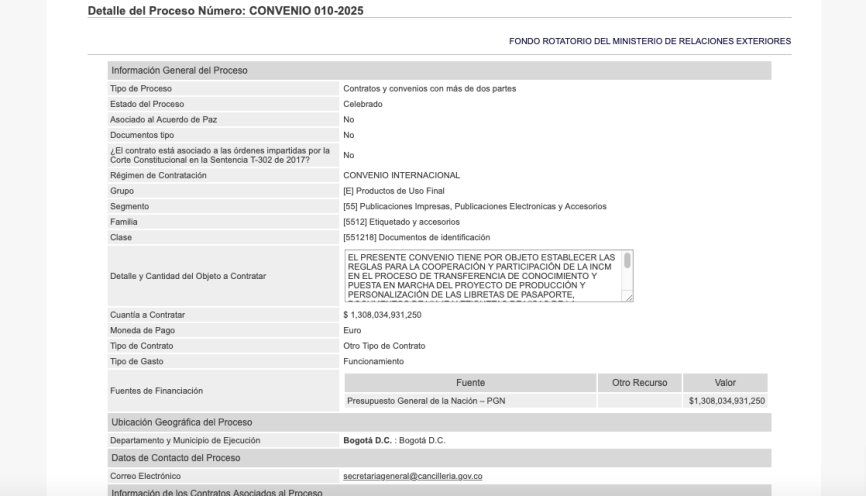 En este contexto, el gobierno nacional publicó en la plataforma de SECOP I el convenio entre la Imprenta Nacional y la Casa de la Moneda de Portugal para la expedición de pasaportes.
