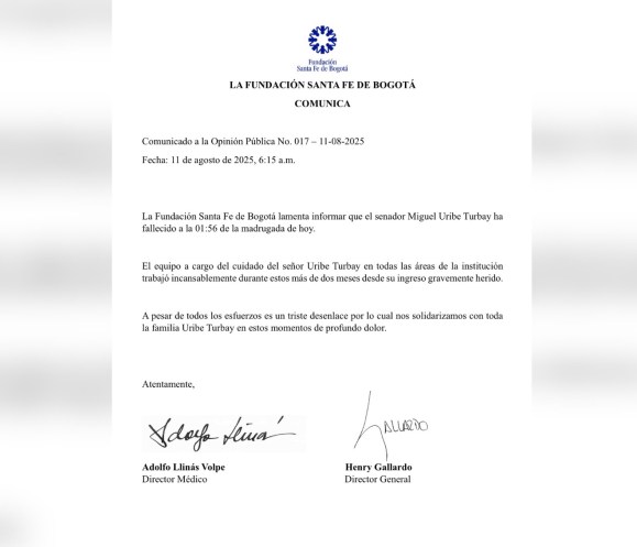 El comunicado lleva las firmas del director médico Adolfo llinás Volpe y del director general de la Fundación Santa Fe, Henry Gallardo.