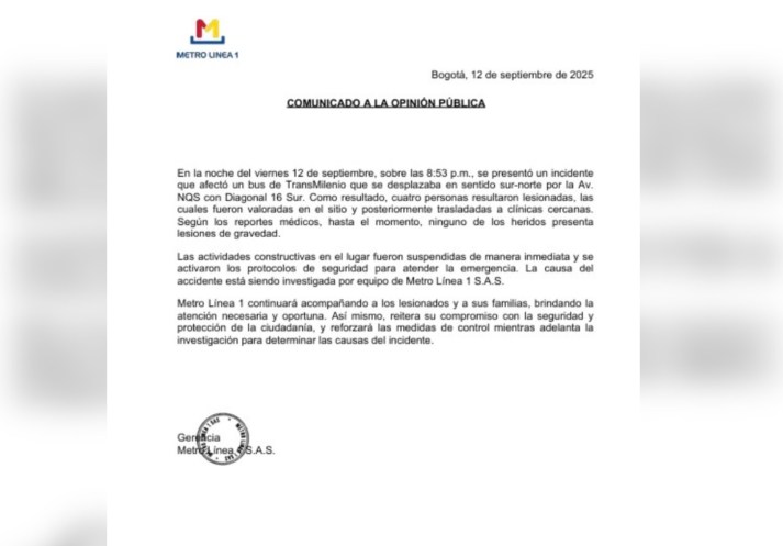“Metro Línea 1 continuará acompañando a los lesionados y a sus familias, brindando la atención necesaria y oportuna. Así mismo, reitera su compromiso con la seguridad y protección de la ciudadanía”, según el comunicado.