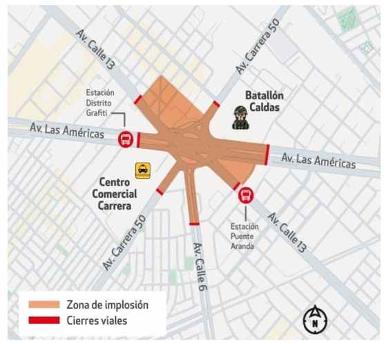 Este domingo 12 de octubre se realizará la demolición controlada a través de la implosión de los puentes que componen la intersección de Puente Aranda, donde convergen la calle Sexta, la av. de Las Américas, la calle 13 y la carrera 50 y que llevan más de 45 años de servicio.