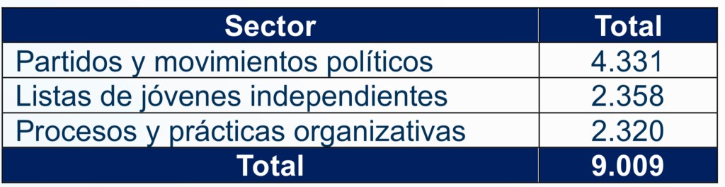 Los mencionados candidatos conforman un total de 9.009 listas, distribuidas así: 4.331 por partidos y movimientos políticos con personería jurídica vigente, 2.358 por listas de jóvenes independientes y 2.320 por procesos y prácticas organizativas formalmente constituidas.