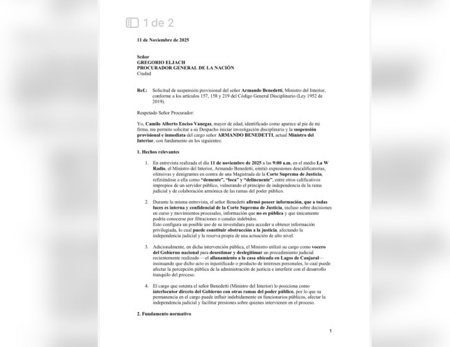 «El cargo que ostenta el señor Benedetti lo posiciona como interlocutor directo del Gobierno con otras ramas del poder público, por lo que su permanencia en el cargo puede influir indebidamente en funcionarios públicos, afectar la independencia judicial y facilitar presiones sobre quienes intervienen en el proceso», indicó Enciso Vanegas en la queja ante la Procuraduría.