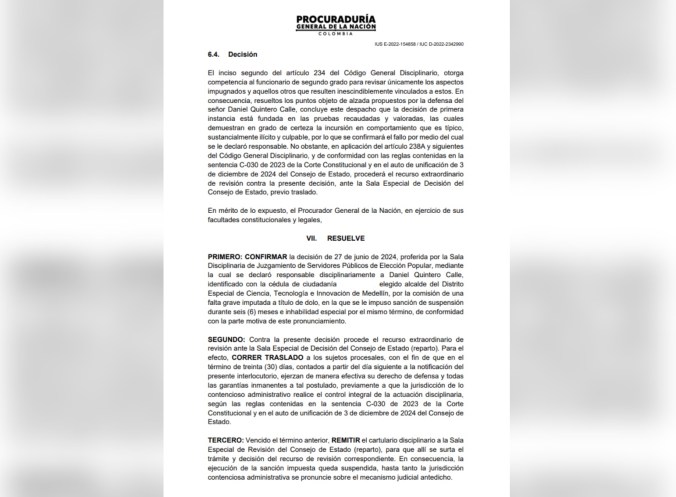 El Procurador General de la Nación, Gregorio Eljach ratificó en segunda instancia la suspensión e inhabilidad especial por seis meses que contra el imputado por corrupción, exalcalde de Medellín, Daniel Quintero Calle, por participación en política.