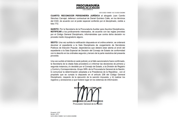 Como se recuerda, la Sala Disciplinaria de Juzgamiento de Servidores de Elección Popular del ente de control, en primera instancia, había determinado que participó en política por el “uso de expresiones veladas a favor del Pacto Histórico, con la finalidad de obtener apoyo a la aspiración de llegar a la Presidencia en la primera vuelta electoral”.