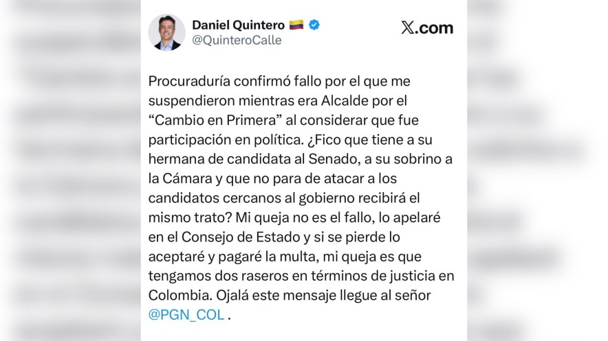 De inmediato, el exalcalde de Medellín respondió a través de su cuenta en X: “Procuraduría confirmó fallo por el que me suspendieron mientras era Alcalde por el “Cambio en Primera” al considerar que fue participación en política”.