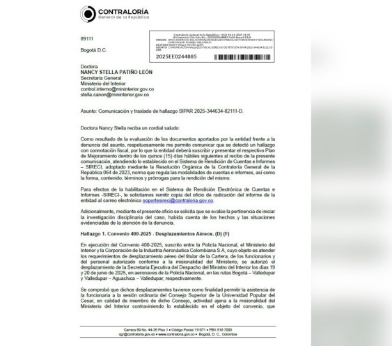 La Contraloría General de la República determinó que los vuelos de Juliana Guerrero Jiménez le costaron a la Nación más de 213 millones 500 mil de pesos, un hallazgo con connotación fiscal, que podría tener una incidencia disciplinaria al Ministerio del Interior por el presunto uso indebido de recursos del Convenio 400-2025 (servicios aéreos).