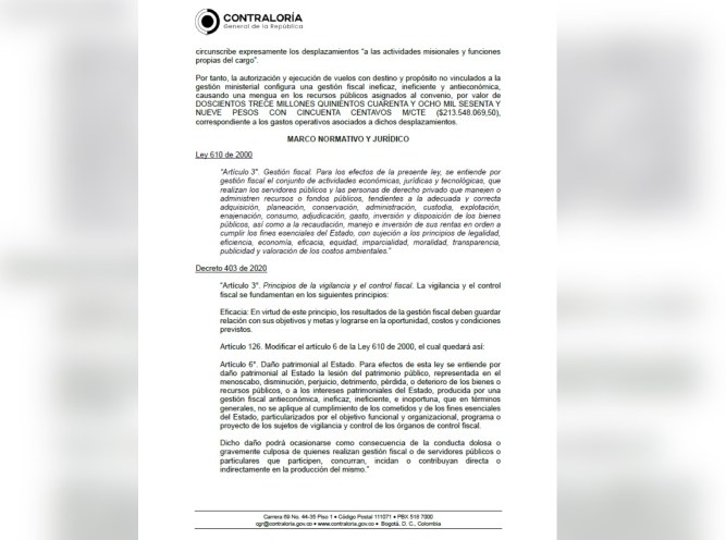 La Contraloría enfatizó que los vuelos de Guerrero constituyeron una «gestión fiscal ineficaz, ineficiente y antieconómica» por parte del Ministerio del Interior «al haberse solicitado apoyo aéreo en el marco del convenio para unos vuelos cuya finalidad no resulta consecuente con la misionalidad ni las funciones del Ministerio».