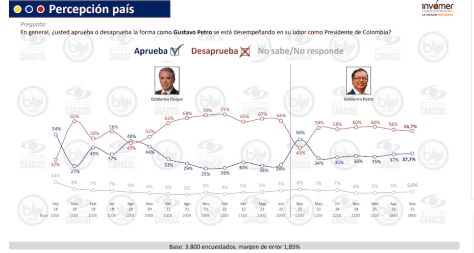 El jefe de Estado registró un 56,7% de imagen desfavorable, frente a un 37,7% de favorable, lo que significa que casi seis de cada 10 encuestados no están de acuerdo con el presente Gobierno.
