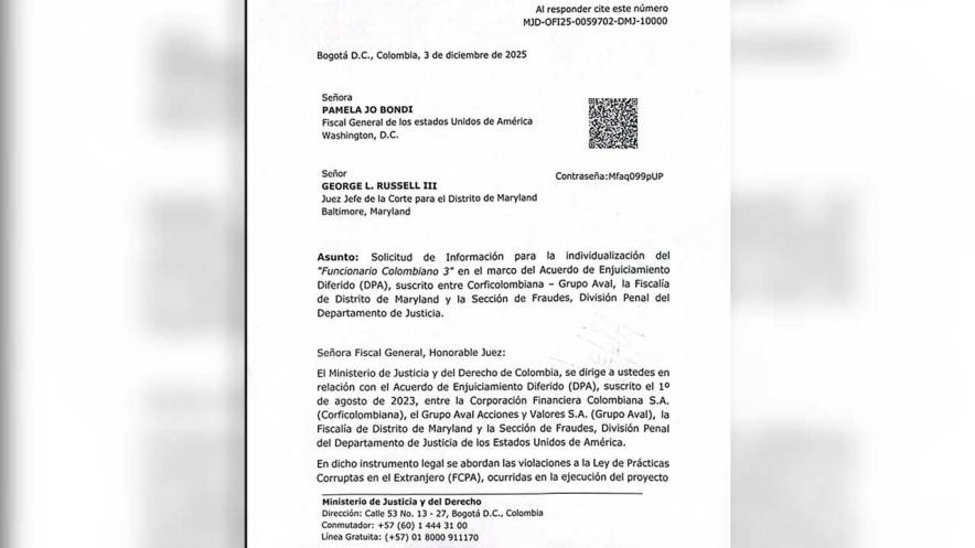 Puntualmente, el ministro solicita información “para la individualización del ‘Funcionario Colombiano 3’, en el marco del Acuerdo de Enjuiciamiento Diferido (DPA), suscrito entre Coficolombiana-Grupo Aval, la Fiscalía del Distrito de Maryland y la Sección de Fraudes, División Penal del Departamento de Justicia de Estados Unidos”. El acuerdo fue suscrito el primero de agosto de 2023.