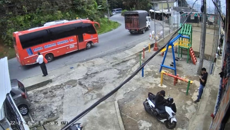 En imágenes de cámaras de seguridad del lugar se puede observar cuando la flota de la empresa Rionegro baja a gran velocidad tras un camión de estacas y, en una curva, lo golpea y cae al barranco.