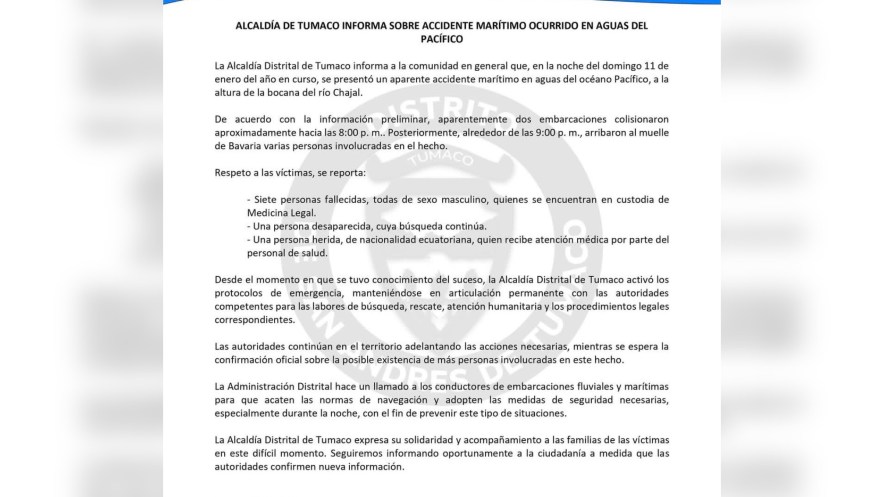 «Desde el momento en que se tuvo conocimiento del suceso, la Alcaldía Distrital de Tumaco activó los protocolos de emergencia, manteniéndose en articulación permanente con las autoridades competentes para las labores de búsqueda, rescate, atención humanitaria y los procedimientos legales correspondientes”, señaló.