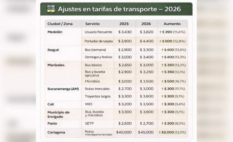El Ministerio de Transporte señaló que si bien la fijación de tarifas corresponde a los entes territoriales recordó que tiene la competencia técnica para pronunciarse sobre la razonabilidad de los incrementos, en particular cuando estos afectan de manera directa a la ciudadanía.