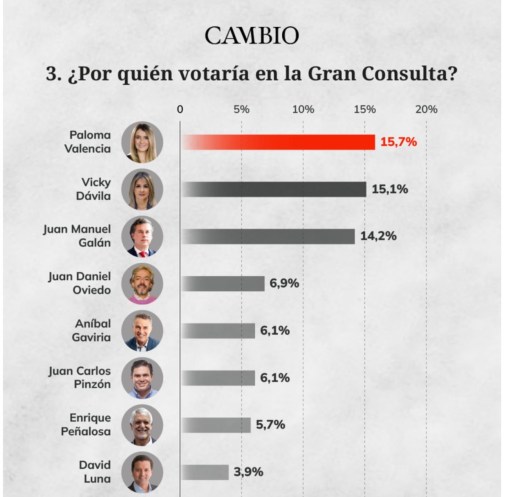 De acuerdo con la medición del CNC, se presenta un empate técnico entre Paloma Valencia 15,7%, Vicky Dávila 15,1% y Juan Manuel Galán 14,2%.