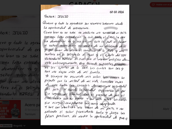 “Estoy haciendo este mensaje de aquí del teléfono de Mártires, el cual uso para llamar a mi familia y al ver noticias me entero que esta semana me pueden sacar de mi país por una falsa extradición, por lo tanto hago este audio para pedir el favor, a la gente, que estén tranquilos, porque les voy a pedir que no vayan a tomar retaliaciones contra el Inpec, contra el comercio, contra el alcalde”, dijo.