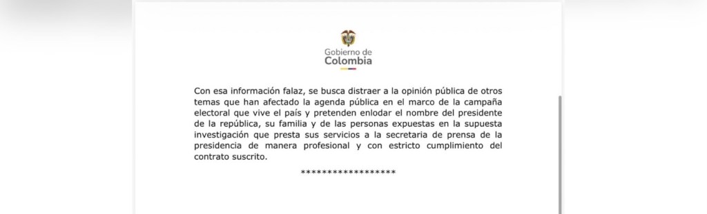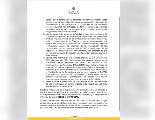 Tras la publicación de esta denuncia, la Presidencia de la República expidió un comunicado de prensa en el que explicó que los contratos interadministrativos con RTVC responden a necesidades identificadas por la Secretaría para las Comunicaciones y Prensa y el Departamento Administrativo de la Presidencia de la República (DAPRE).