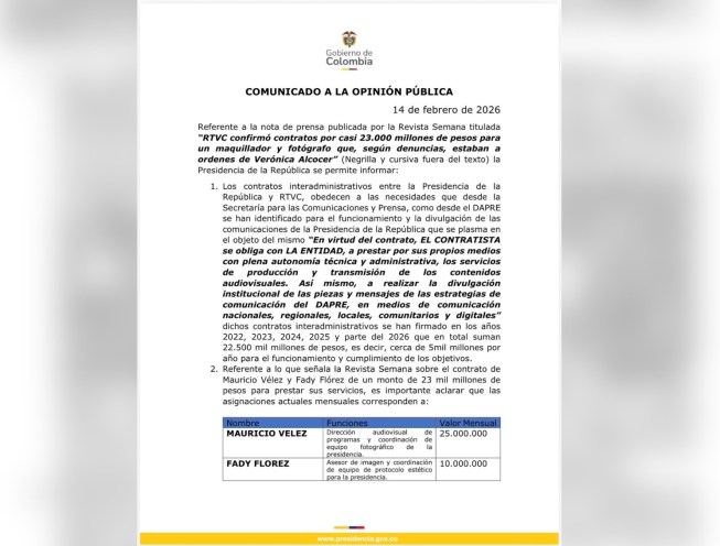 La revista SEMANA publicó una información según la cual RTVC suscribió contratos de prestación de servicios de un maquillador y un fotógrafo, que estarían a disposición de Verónica Alcecer, por cerca de 23 mil millones de pesos