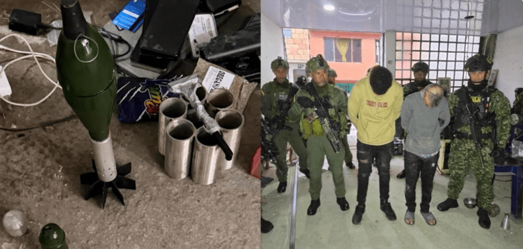 En la acción, en la que participaron uniformados de la Policía en articulación con el Gaula Militar, la Fiscalía, con el apoyo de la DEA de Estados Unidos, dos personas fueron capturadas y se incautó material suficiente para fabricar más de 70 AEI. Así mismo, se incautó un lanzagranadas, munición y otros elementos.