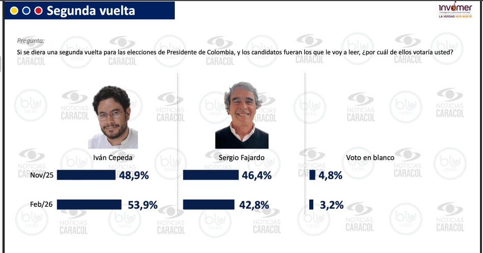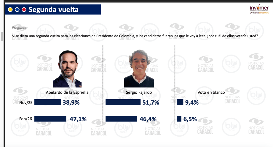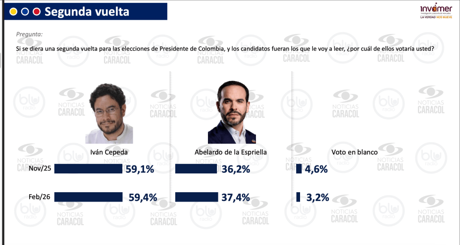 Los candidatos Iván Cepeda y Abelardo de la Espriella lideran la intención de voto con mias a las elecciones presidenciales de 31 de mayo primera vuelta y 21 de junio segunda vuelta, de acuerdo con la más reciente encuesta Colombia Opina, realizada por la firma Invamer S.A.S para Noticias Caracol y Blu Radio.