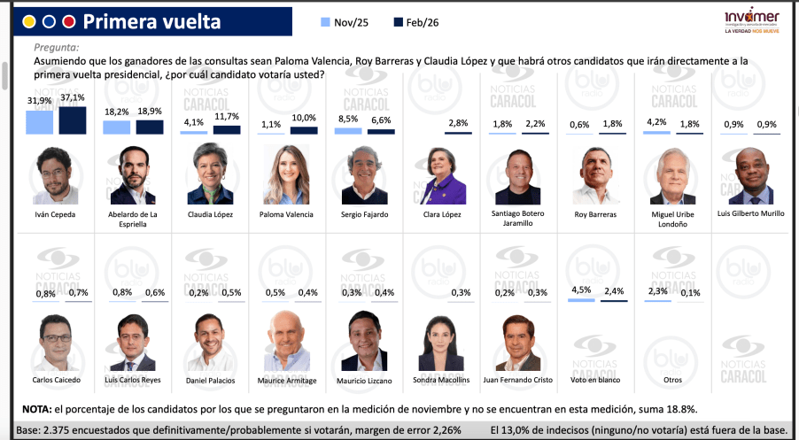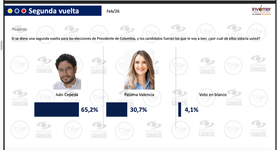 Iván Cepeda obtendría el 37,1 % seguido de Abelardo de la Espriella 18,9 %, Claudia López 11,7 %, Paloma Valencia 10,0 % 6,6 % Sergio Fajardo, Clara López 2,8 % y Santiago Botero 2,2 %.