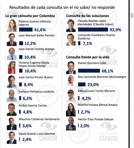 – Gran Consulta por Colombia: Paloma Valencia 41,6 %, Juan Manuel Galán 12,2%, Juan Daniel Oviedo con 10,4 %, Vicky Dávila con 10,4 %, Juan Carlos Pinzón con 8,4 %, Enrique Peñalosa con 6,2 %, Aníbal Gaviria con 4,8 %, Mauricio Cárdenas con 3,6 % y David Luna con 2,4%.