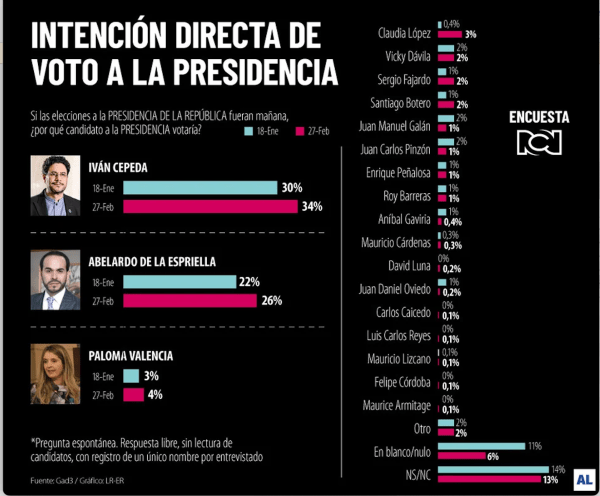 Iván Cepeda 34 %, Abelardo de la Espriella 26 %, Paloma Valencia 4 %, Claudia López 3 %, Vicky Dávila 2 %, Sergio Fajardo 2 %, Santiago Botero 2 %, Juan Manuel Galán 1 %, Juan Carlos Pinzón 1 %, Enrique Peñalosa 1% y Roy Barreras 1 %.