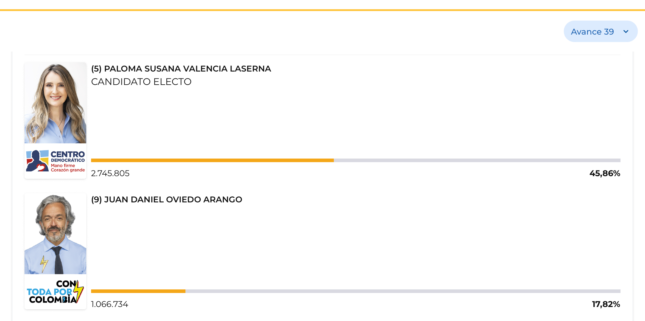 La candidata presidencial, Paloma Valencia ganó con más de 280.000 votos La Gran Consulta por Colombia, que en su conjunto obtuvo más de 5.100.000 votos, arrasando frente a las otras dos consultas interpartidistas. Hasta el boletín 4 con el 88.92 % de mesas informadas, la candidata del Centro Democrático obtuvo 2.853.617 votos por encima de … Continuar leyendo Paloma Valencia arrasa en la Gran Consulta por Colombia y va a la primera vuelta presidencial, Oviedo la sorpresa