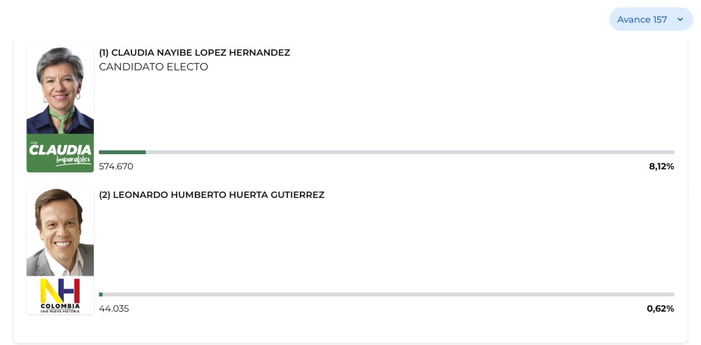 La Consulta de las Soluciones alcanzó 618.705 votos, de cuales cuales, la exalcaldesa de Bogotá, Claudia López obtuvo 574.670 y Leonardo Huertas, 44.035.
