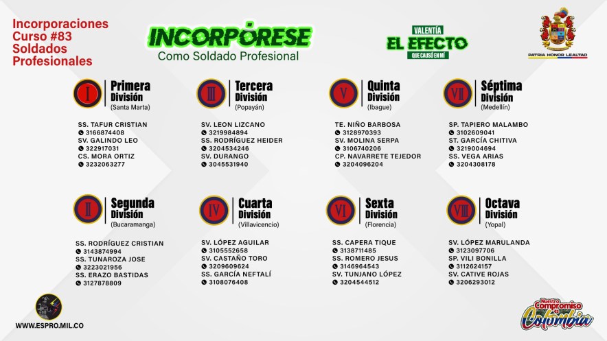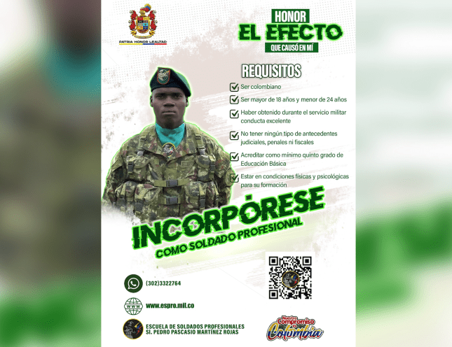 Con el propósito de obtener información oficial y evitar ser víctima de fraudes, los interesados deben acudir a la Unidad Militar más cercana o consultar exclusivamente los canales autorizados del Ejército Nacional y de la Escuela Militar de Soldados Profesionales, a través del sitio web www.espro.mil.co o la línea celular 302 3322764.