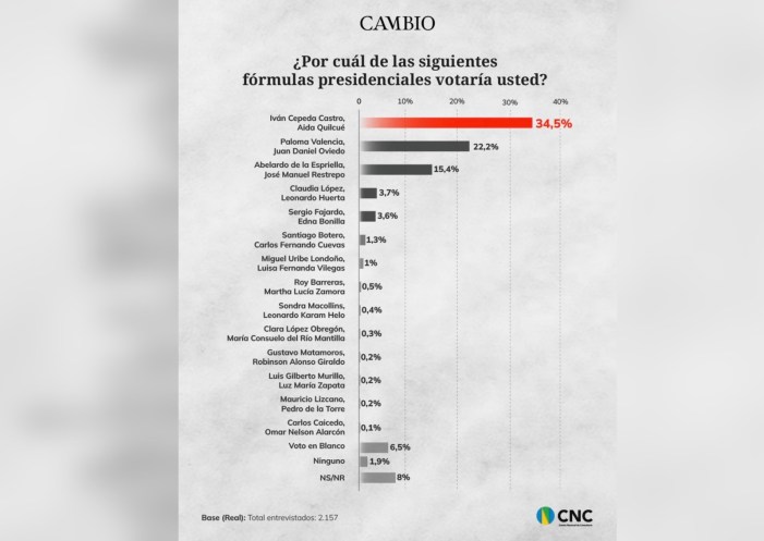 La revista CAMBIO publicó los resultados de la encuesta del Centro Nacional de Consultoría en la que se confirma la intención de voto favorable para el candidato del Pacto Histórico, Iván Cepeda.