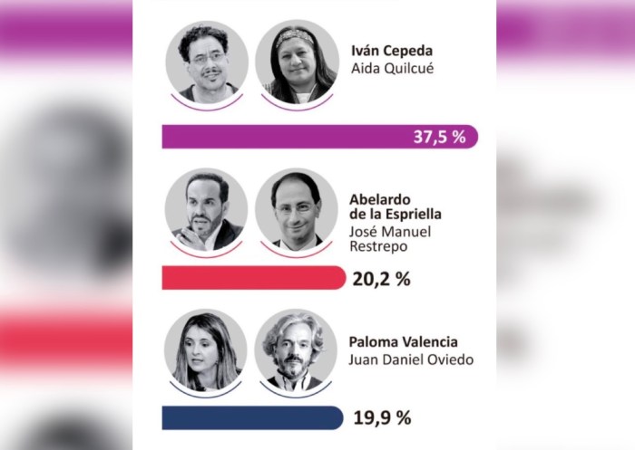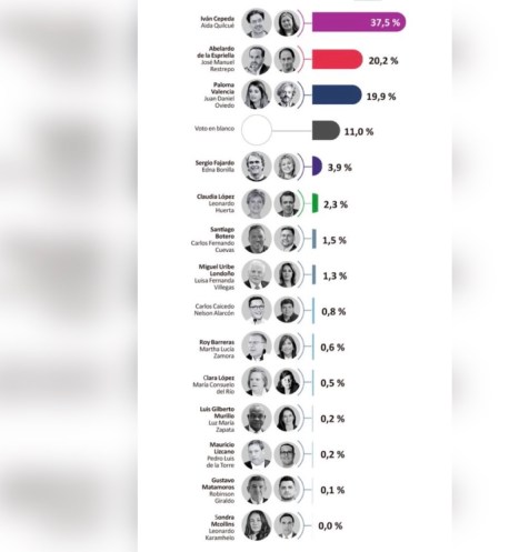 – Iván Cepeda 43 % – Paloma Valencia 40 %, Dado el margen de error 2,25 % de la encuesta, se registra un empate técnico.