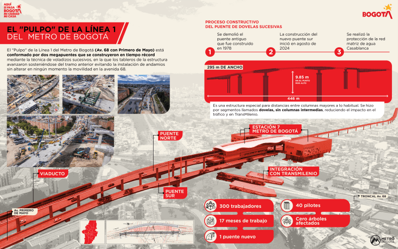 “El proyecto de la Línea 1 del Metro de Bogotá va bien, hoy habilitamos este puente que va a facilitar la movilidad en este sector de la ciudad; en este punto que llamamos el pulpo también confluyen las obras del grupo 1 de la 68, que recibimos en 0 % y ya alcanzan el 39 %”, añadió el alcalde Galán.