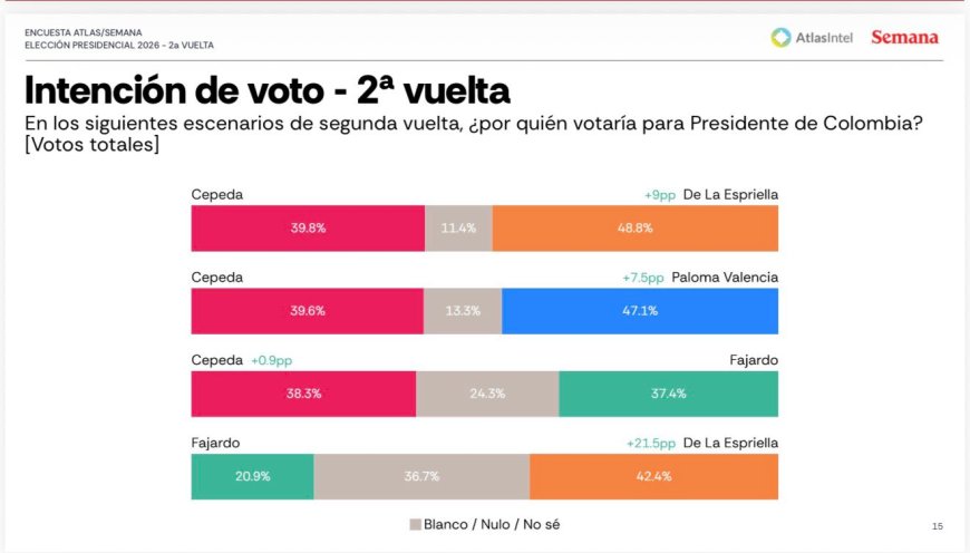 Los candidatos de derecha Paloma Valencia y Abelardo de la Espriella le ganarían al candidato de la izquierda, Iván Cepeda en un escenario de segunda vuelta presidencial, según la más reciente encuesta de AtlasIntel publicada por SEMANA.
